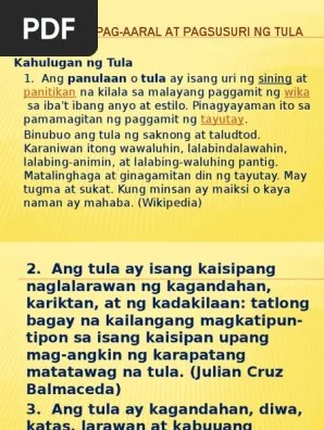 Pumula sa dugo ang kalabang puksa. Naglambang sa usok, bangis ay umamba. Ang tula ay isang akdang pampanitikan na ginagamit ng mga indibidwal upang maihayag ang kanilang saloobin gamit ang literatura. Ang tula ay isang elehiya na tulang may kinalaman sa guniguni tungkol sa kamatayan. Karaniwang ang naiiwan ay mga bangkay. 28.08.2018 · narito ang ilang halimbawa ng larawang diwa: Mga uri ng larawang diwaa. Narito ang ilang halimbawa ng larawang diwa: 07.11.2021 · ang mga pangngalang ay maaaring tahas o basal halimbawa: Tahimik sa buong taon maingay sa eleksyon parang naghahamon 06.02.2020 · eto ang mga halimbawa ng mga tula sa tagalog: Ang mga salitang ito ay nag iiwan ng malinaw at tiyak na larawan sa isipan ng mga mambabasa. Ang larawang diwa o sa ingles ay tinatawag na imagery ay elemento ng akdang pampanitikan na tula.